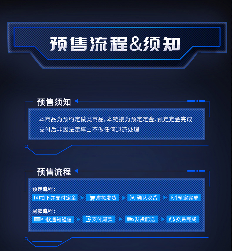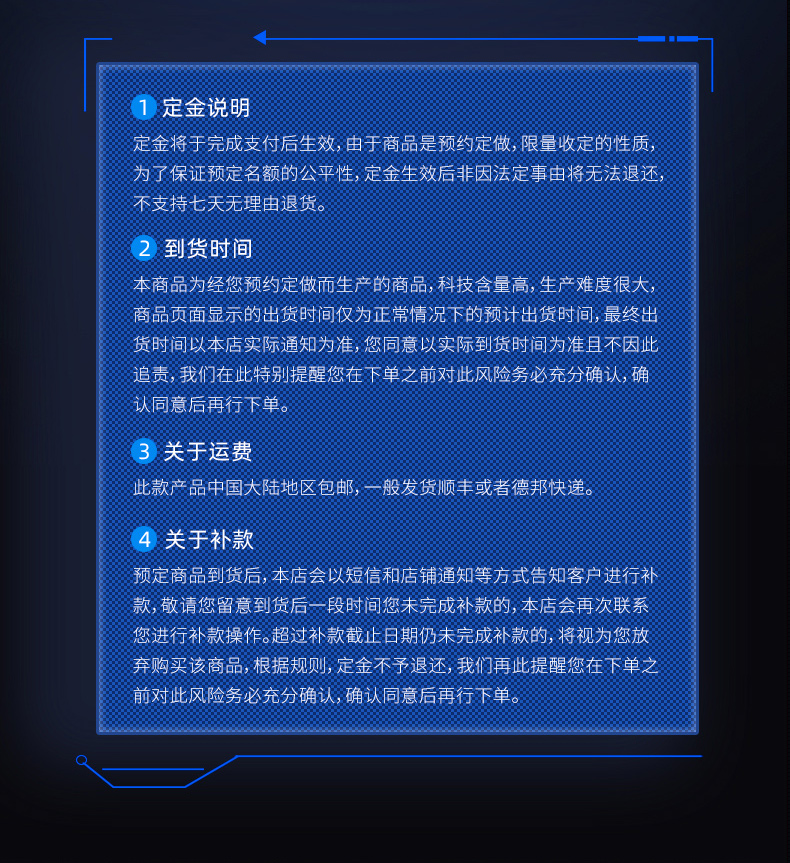 本店合作是建立在诚信的基础上,我们不希望增加各位商家的资金压力,所以非必须收定金的产品一般都不会收取定金(如厂家需要收取定金的会按厂家要求收取),但是不允许出现弃单不补款行为。一旦出现以上行为,在本店已预定的所有产品和新订单将会以付定金为准。收到付款通知后7天内仍未付款的将视为弃单。之后再下单将收取全额货款。弃单两次则进入黑名单,所有订单取消,所有定金不予退还,终止合作。
