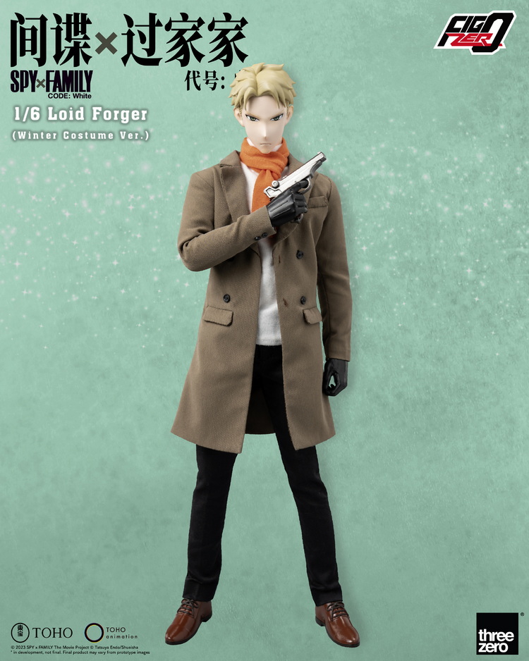 FigZero 1/6 劳埃德·福杰(冬季服装版)穿上《剧场版 SPY×FAMILY CODE: White》里的服装,包括白色衬衫、棕色大衣、棕色颈巾、长裤、鞋子,还有眼镜和手表。其他配件包括一把手枪、两个可互换面部部件(普通表情和微笑表情)和三双可互换手,以搭配他的动作姿势使用。