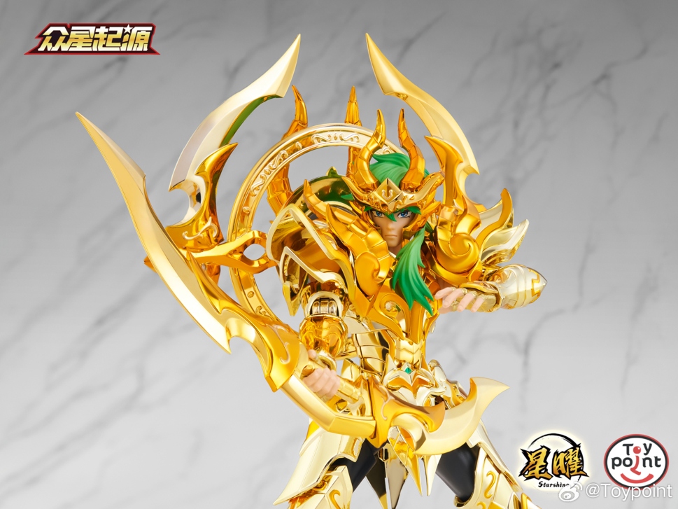 摩羯座配备了巨大的圆环背饰。圆环上设有数片可拆卸的锋利刀刃,这些刀刃能够自由组合成两把弯刀或者新月形状的月刃,极大提升了产品的互动性与可玩性。
