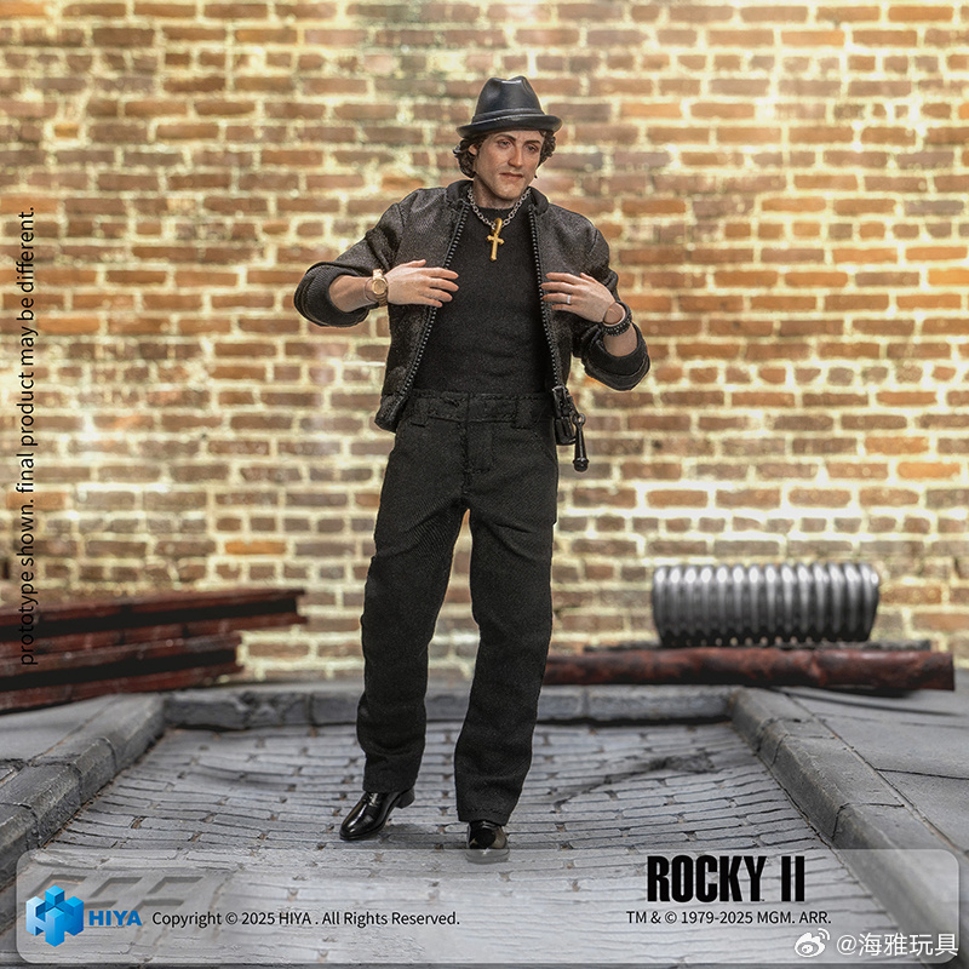 全新EXQUISITE SUPER系列1/12比例 洛奇 可动人偶,全高约16CM,以《洛奇 II》中经典日常街头形象为设计原型打造。头雕细节精细刻画,配备微笑与严肃两款可替换头雕,呈现出洛奇在本作中截然不同却同样真实的精神状态,使角色形象更加立体。以深色日常穿搭为设计基础,头戴黑色帽子,身着深色夹克与休闲长裤,造型低调朴实,突出角色回归现实生活后的质感与氛围。通过多处可动关节设计,搭配4个可替换手型,使您可轻松再现站立、行走等多种造型姿态,重现洛奇在费城街头的经典画面。随附展示地台与支架,并附属洛奇的忠实伙伴——巴特库斯,助您进一步还原影片中真实而温暖的生活质感。