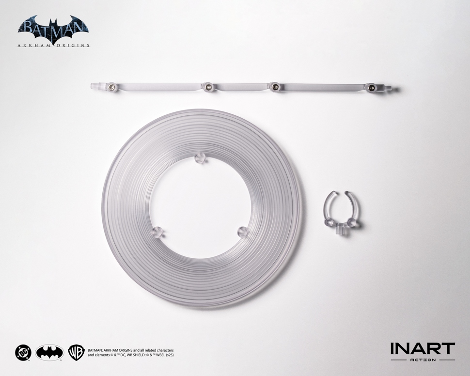作品配件:人物主体*1,平静头头雕*1,愤怒头头雕*1、戴拳套持枪手型*1对、戴拳套持镖右手*1、戴拳套握把手右手*1、戴拳套握拳手型*1对、铁丝披风*1、遥控蝙蝠镖*1、普通蝙蝠镖*1、声纳蝙蝠镖*1、索道枪*1、铁丝*1、电击特效件*2、地台*1、透明支架*1